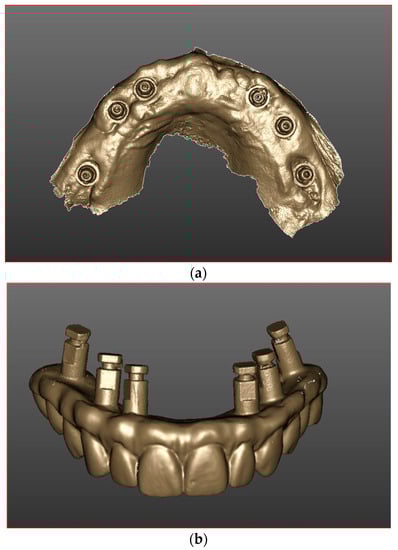 - Gherlone, E.F.; Ferrini, F. Digital Impressions for Fabrication of Definitive “All-on-Four” Restorations. Implant Dent. 2015, 24, 125–129. [Google Scholar] [CrossRef] [PubMed]
