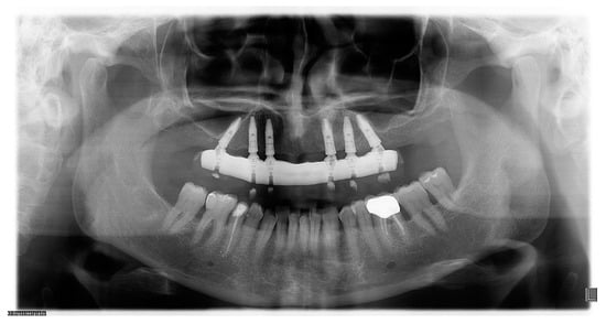 - Maló, P.; de Araùjo Nobre, M. All-on-4® Treatment Concept for the Rehabilitation of the Completely Edentulous Mandible: A 7-Year Clinical and 5-Year Radiographic Retrospective Case Series with Risk Assessment for Implant Failure and Marginal Bone Level. Clin. Implant Dent. Relat. Res. 2015, 17, e531–e541. [Google Scholar] [CrossRef] [PubMed]
