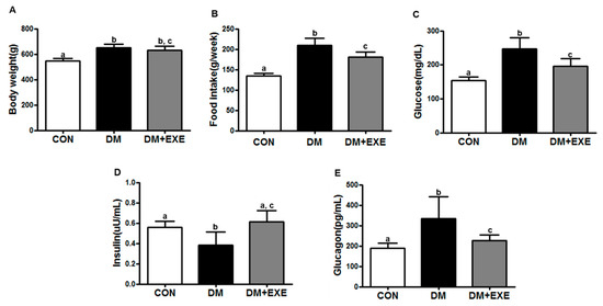 3.1. Resistance Exercise Improved Food Intake, Gluocse, Insulin, and Glucagon Levels in T2DM Rats Regardless of Body Weight
