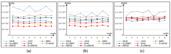 Prediction root mean squared error (RMSE) of the eight models using different time lags. x-axis denotes the time lag in weeks, and y-axis denotes the RMSE. (a) Chronic gastroenteritis; (b) gastrointestinal ulcers; (c) gastrointestinal tumors. MLR: multiple linear regression; ANN: artificial neural network; DBN: deep belief network; EvoDBN: evolutionary DBN; DAE: deep autoencoder; EvoDAE: evolutionary DAE; DDAE: deep denoising autoencoder; EvoDDAE: evolutionary DDAE.