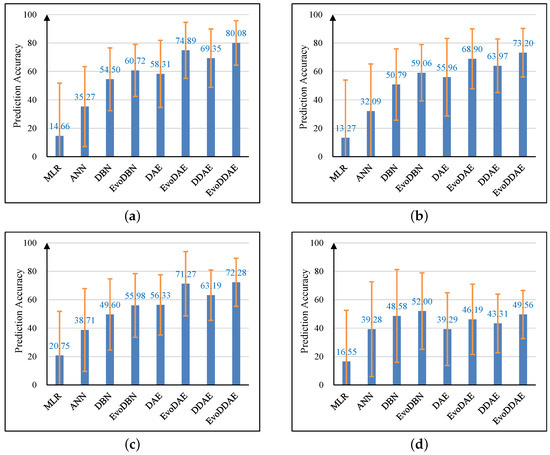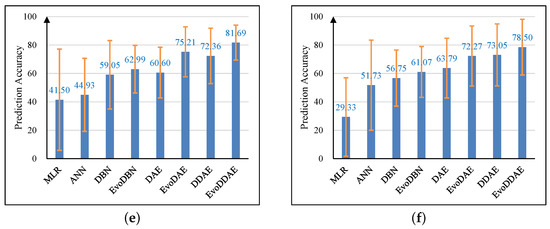 Figure 2a–f presents the prediction accuracies of the models for the six gastrointestinal diseases, respectively. Results show that the traditional MLR exhibits the worst prediction performance on all diseases, the shallow ANN exhibits significantly better performance than MLR, and all deep-learning models exhibited much better performance than the MLR and shallow ANN. Among the six deep models, EvoDDAE exhibited the best performance on five diseases except gastrointestinal tumors. The average prediction accuracy of EvoDDAE was over 80% on acute gastroenteritis and food poisoning, close to 80% on other gastrointestinal infections, and approximately 72%–73% on chronic gastroenteritis and gastrointestinal ulcers. For gastrointestinal tumors, except that EvoDBN obtained an average perdition accuracy of approximately 52%, the accuracies of all other models were less than 50%, which indicates that the gastrointestinal-tumor morbidity is difficult to predict using these models. We also observed that, in most cases, the performance of a deep model could be significantly improved by using evolutionary training to replace traditional gradient-based training.