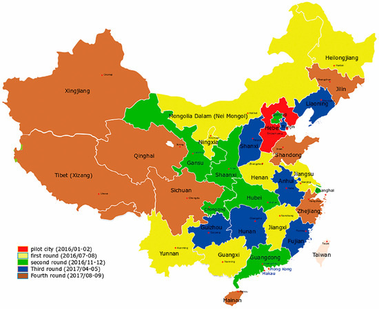 At the end of 2015, the “first sword” of the environmental inspection team, headed by the central government, focused specifically on Hebei and conducted a pilot project of environmental protection inspections for one month. Between 2016 and 2017, central environmental protection inspections fully investigated 31 provinces in China (Figure 2).