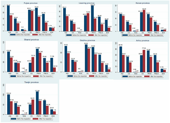 Figure 3 shows the mean difference in air quality before and after the third round (taking into account the length of the article, this section shows the third round of environmental inspections) of central environmental protection inspections. Except for O3, the concentrations of other pollutants in the seven provinces showed different degrees of decline. The improvement in PM2.5 and PM10 in each province was very large. In addition to the relatively small improvement in the AQI index in Hunan and Guizhou, other provinces have seen significant improvements. In trying to explain these changes, it can be seen that the provinces with greatly improved air quality originally had poor air quality, and the room to improve was therefore greater than that of Hunan and Guizhou, where the air quality was better.