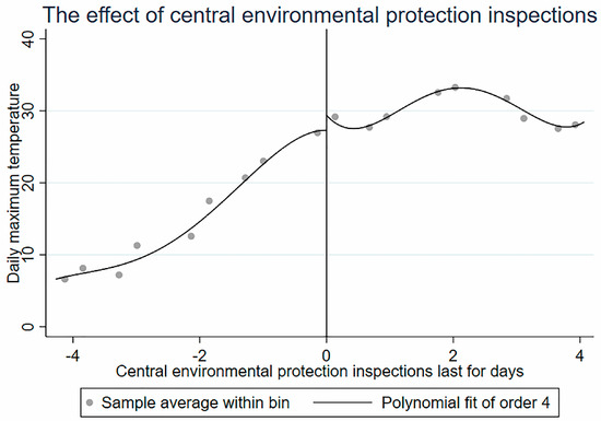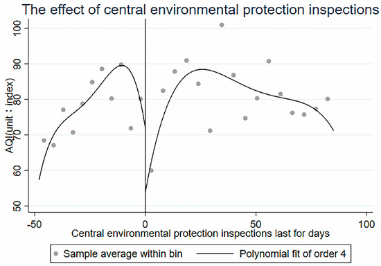 where is the province, is the date, is the air quality index of province on date , is representative of the dummy variable of the central environmental protection inspections, and province is 1 after the date of the inspections or 0 before. is an execution variable that indicates the number of days from the date of the central environmental protection inspections. It is 0 on the day of the inspection, greater than 0 after the inspection, and less than 0 before the inspection, and is a polynomial function with as the independent variable. is a set of weather control variables, including maximum temperature, minimum temperature, whether there is rain, whether there is snow, and wind size variables to control the impact of weather factors on air quality. is the regional fixed effect for the city . is a time-fixed effect. This article controls for the year, month, week, and legal holidays, etc., to control the seasonal factors and the impact of people’s working schedule on air quality. is a stochastic disturbance term. In equation (1), the main concern of this paper is , which captures the difference in air quality before and after the central environmental protection inspections. Of course, many factors affect the air quality of a city, such as geographical factors, industrial structure, energy structure, and car ownership, but these urban characteristics generally do not change in the short term (the time span of the data in this paper is 5 months). Thus, these factors have been controlled by using the fixed effect model of panel data, and the missing variable bias has been alleviated to some extent [36].