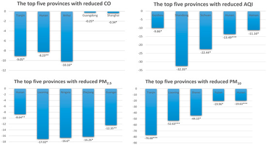 From Table A2 (see Appendix B, Table A2) and Figure 5, we can see that the governance results for PM10 and AQI in each province are very significant. Other pollutants have different governance effects depending on the province. However, even in provinces in the same region, the effects of pollutants may have different effects (for example, Qinghai, Gansu and Tibet all belong to the western region (China’s regional differences can be roughly divided into three economic zones—the eastern, central and western regions—based on characteristics such as development level, geographical location, economic linkages, and energy consumption structure) but the governance effects of CO and NO2 show opposite results). The differences in these results may be related to the geographical factors, economic base, industrial structure, technical conditions and pollution prevention efforts of the provinces. The chain effect caused by this series of factors is the difference in local government environmental governance behavior. This explains why provinces in the same region have different governance effects on different pollutants. Under the impetus of central environmental protection inspections, we can see that the ranking of pollutant reduction in Hunan Province is very high, which may be related to the fact that the number of accountants is the highest among environmental protection inspectors. Other provinces with more pollution reductions were originally the areas that were most affected by air pollution. Therefore, the range that can be adjusted is large.