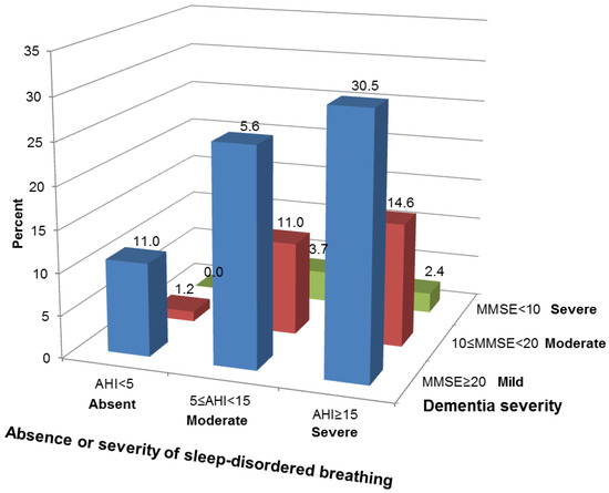 In 82 of the 101 dementia patients (81.2%), AHI could be determined during overnight polygraphy according to the manufacturer’s suggestions (https://airview.resmed.com/resources/ welcome-page/pdf/Apnealink-Air_clinical_guide_glo_eng.pdf). Of those 82 patients, 10 patients (12.2%) had an AHI < 5/h, representing absent SDB, 33 patients (40.2%) had a 5/h ≤ AHI < 15/h, representing mild SDB, and 39 patients (47.6%) had an AHI ≥ 15/h representing moderate/severe SDB. Patients in those three AHI categories did not significant differ from each other in demographical and clinical characteristics (Table 1).