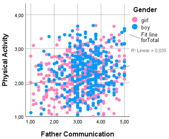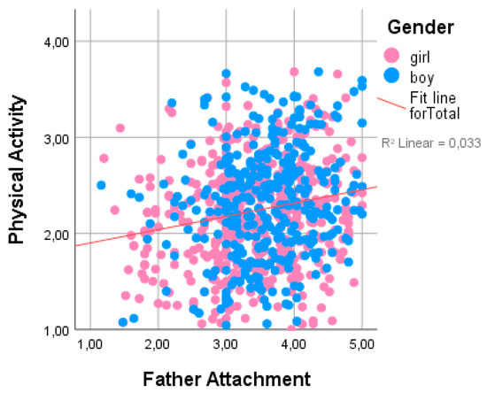 Table 2 presents the potential interrelationships among physical activity and other variables studied. Physical activity had statistically significant positive correlations with all father and mother IPPA domains, but the strongest correlations were found with father attachment (r = 0.18, p = 0.01) (see Figure 1) father trust (r = 0.17, p = 0.01), and father communication (r = 0.19, p = 0.01) (see Figure 2), and negative correlations were found with father alienation (r = −0.13). Physical activity was also positively related to SES (r = 0.12) and negatively related to age (r = −0.13). No significant correlations were found between physical activity and peer trust, peer communication, or peer alienation in the general group. However, among boys, physical activity was positively related to peer trust (r = 0.14, p = 0.01) and peer communication (r = 0.13, p = 0.01). We found a positive relationship between physical activity and SES (r = 0.12, p = 0.01).