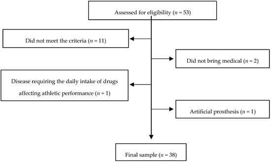 In this cross-sectional study, 38 active older women (>65 years old) (age = 72.29 ± 5.21 year), from Andalusia, southern Spain, participated voluntarily. Figure 1 shows a flowchart of the study participants. The inclusion criteria were that subjects were: (I) not institutionalized; (II) active women and above the age of 65; (III) not suffering from mental and/or intellectual disorders; (IV) free of cardiovascular and neuromuscular disorders; (V) considered physically independent according to the Spanish version of the Barthel Index [23]. The exclusion criteria were: (a) participation in other training programs; (b) artificial prosthesis; (c) any disease requiring the daily intake of drugs affecting athletic performance, in order to avoid any influence on fitness measures; (d) any disease that contraindicated the exercise program; (e) any symptom that a medical professional deemed as warranting exclusion. The study was conducted in compliance with the standards of the Declaration of Helsinki (version 2013) and following the guidelines of the European Community for Good Clinical Practice (111/3976/88 of July 1990), as well as the Spanish legal framework for clinical research in humans (Royal Decree 561/1993 on clinical trials). It was approved by the Bioethics Committee of the University of Jaén (DIC. 17/3.TFM). All subjects completed an informed consent form to participate in the study.