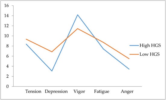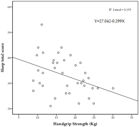 As previously mentioned, several studies have showed the possible predictive character of insomnia for depression [10,33] and how people with insomnia or reduced sleep quality may have a higher risk of depression throughout their lives [34]. Scott [10] analyzed the deprivation of 30 h of sleep in six students divided into two groups, one that remained sedentary and one that performed an exercise cycle of 20 min every 2 h. In the results, no significant differences were found between the groups with respect to mood and depressive symptoms in the interval of sleep deprivation, but on both scales the levels increased as the sleep deprivation became greater, reaching their highest values in depression and fatigue at 26 h of sleep deprivation. However, with regard to vigor, the highest value was obtained at 6 h of sleep deprivation. The results of the present study show that with high HGS values, higher sleep satisfaction scores were obtained, while for low HGS values a higher score for insomnia and hypersomnia was obtained. This shows a direct association between HGS and sleep data that the present authors have not been able to contrast with previous studies because, to their knowledge, this association has not been previously studied. It is also true that sleep disorders are affected by obesity and a higher rate of BMI, since excessive weight can hinder breathing during sleep and cause obstructive sleep apnea, which causes people suffering from it to have greater sleep interruption, lower quality of sleep and daytime sleepiness [9]. However, in the present study it was observed that there were no differences between both the high and low HGS groups in terms of BMI. In addition to the BMI, it has been studied how a higher index of fat mass affects HGS showing that lower values of HGS are obtained when the fat mass index is higher [15]. In the present study, a study of the bioimpedance of the subjects was not carried out, which could be considered a limitation.