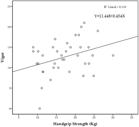 It has been observed that HGS in a centennial population had a strong association with physical function and mood, where higher levels of HGS corresponded with a positive mood and continuity in carrying out daily activities [19]. The predictive nature of HGS has also been analyzed, showing a direct association with the functional domains of health and cognitive and social levels, and an inverse association with depressive values. HGS can be considered a causal factor of depressive symptoms [20,21].