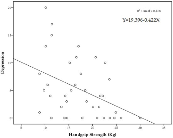 In other studies, an association between low physical function (assessed by muscle strength index in the lower extremities), self-perceived functional decline, gait speed, and depressive symptoms has been identified [31,32]. As in this study, a recent study by Latorre Román et al. suggested a bidirectional association between depressive symptoms and HGS; they analyzed and found a correlation of HGS with the speed of walking [32].