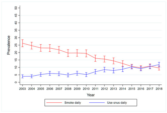 Figure 1 illustrates the inverse correlation between smoking and snus use in the adult Norwegian population for the period 2003–2018.