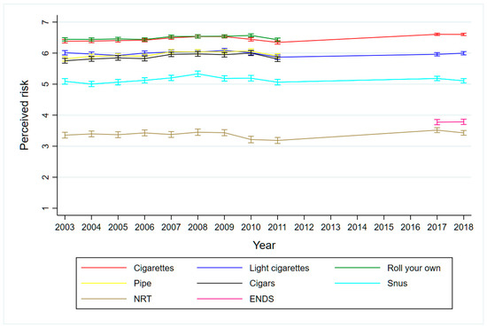 We used an indirect measure of perceived relative harm. The wording of the question was: “We will now mention a variety of nicotine products and ask you how harmful you think daily use of these are. Use a scale from 1 to 7, where 1 is slightly harmful and 7 is very harmful”. Combustion products included conventional manufactured cigarettes, manufactured cigarettes with reduced nicotine and tar, roll-your-own cigarettes, cigars/cigarillos and pipe. The latter three were not included in the 2017/18 surveys. Non-combustible products included Swedish snus, NRT and e-cigarettes (ENDS). The latter was only included in the 2017 and 2018. Respondents who ticked off a “don’t know”-category, were excluded from the analysis.