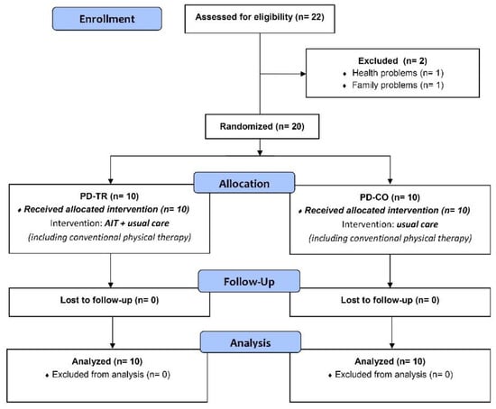 Patients from the PD-TR group attended, on average, 23.44 ± 0.73 out of the 24 AIT sessions (97.66% attendance) with complete attendance (24/24 sessions) by six patients, participation in 23/24 sessions by three patients, and participation in 22/24 sessions by one patient. All 20 patients underwent all assessments in the PRE and POST testing sessions (performed in spring: March–June), and all primary and secondary outcomes from these assessments were finally analyzed.
