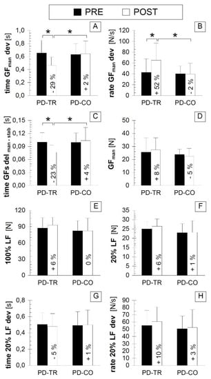 Comparison of the bimanual motor control outcomes between the two testing sessions and the two tested groups. (A) panel A presenting the values of time GFman dev; (B) panel B presenting the values of rate GFman dev; (C) panel C presenting the values of time GFs del man-stab; (D) panel D presenting the values of GFman; (E) panel E presenting the values of 100% LF; (F) panel F presenting the values of 20% LF; (G) panel G presenting the values of time 20% LF dev; (H) panel H presenting the values of rate 20% LF dev. Abbreviations: PRE—testing session before the eight weeks of training; POST—testing session after the eight weeks of training; PD-TR—Parkinson’s disease patients from the training group; PD-CO—Parkinson’s disease patients from the control group; GFman—peak value of grip force in the manipulating hand during the 20% load force trial; time GFman dev—time taken for GFman development; rate GFman dev—rate of GFman development; time GFs del man-stab—time delay between the onset of grip force development in the manipulating hand and that in the stabilizing hand; 100% LF—the value of achieved maximal load force; 20% LF—the peak value of developed LF during the trial of 20% LF; time 20% LF dev—the time taken for 20% LF development; rate 20% LF dev—the rate of 20% LF development; the % value inserted into the bar of the POST session indicates the percentage value of the change between the POST and PRE testing sessions; *—statistically significant inter-testing session or inter-group difference at the p ≤ 0.05 level.