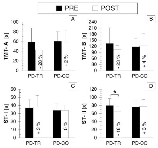 Comparison of psychological cognitive outcomes between the two testing sessions and the two tested groups. (A) panel A presenting the values of TMT-A; (B) panel B presenting the values of TMT-B; (C) panel C presenting the values of ST-I; (D) panel D presenting the values of ST-II. Abbreviations: PRE—testing session before the eight weeks of training; POST—testing session after the eight weeks of training; PD-TR—Parkinson’s disease patients from the training group; PD-CO—Parkinson’s disease patients from the control group; TMT-A—part A of the Trail Making Test; TMT-B—part B of the Trail Making Test; ST-I—part I of the Stroop Test; ST-II—part II of the Stroop Test; *—statistically significant inter-testing session or inter-group difference at the p ≤ 0.05 level; the % value inserted into the bar of the POST session indicates the percentage value of the change between the POST and PRE testing sessions.