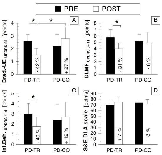 Comparison of neurological outcomes between the two testing sessions and two tested groups. (A) panel A presenting the values of Brad.-UEUPDRS 23; (B) panel B presenting the values of DLMFUPDRS 8–11; (C) panel C presenting the values of Int.Beh. UPDRS 1–4; (D) panel D presenting the values of S&E DLA scale. Abbreviations: PRE—testing session before the eight weeks of training; POST—testing session after the eight weeks of training; PD-TR—Parkinson’s disease patients from the training group; PD-CO—Parkinson’s disease patients from the control group; UPDRS—Unified Parkinson’s Disease Rating Scale; Brad.-UEUPDRS 23—bradykinesia of the upper extremity based on point 23 from the UPDRS; DLMFUPDRS 8–11—daily life manual functions based on the sum of points 8–11 from the UPDRS; Int.Beh. UPDRS 1–4—intellectual and emotional state based on the sum of points 1–4 from the UPDRS; S&E DLA scale—Schwab and England Daily Living Activity Scale; *—statistically significant inter-testing session or inter-group difference at the p ≤ 0.05 level; the % value inserted into the bar of the POST session indicates the percentage value of the change between the POST and PRE testing sessions.