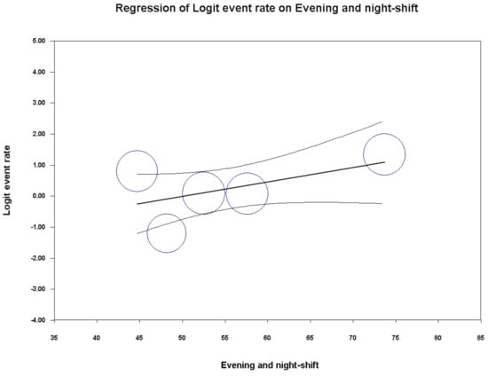 Univariate meta-regression analysis failed to capture any significant association between the percentage of poor sleepers and the variables under study (publication year p = 0.8762; country p = 0.1066; mean age p = 0.2252; percentage of female participants p = 0.9604; BMI p = 0.9844; hierarchical role p = 0.3549). Interestingly, the association between the percentage of poor sleeper and the policemen under evening/night shift yielded a statistically borderline result (coefficient = 0.05, SE = 0.03 [95%CI –0.01 to 0.10], z-value = 1.76, p = 0.0782), as shown in Figure 5. For the other variables under study, it was not possible to perform any meta-regression analysis due to the insufficient number of studies. Furthermore, for the same reason, it was not possible to run a multivariate meta-regression analysis.