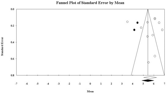 The PSQI global score was reported by 11 papers and ranged between 6.8 and 3.5. In most of the researches included, a high PSQI global score was reported, well exceeding the PSQI cut-off of 5. As pictorially shown in Figure 6, the pooled mean score of the PSQI resulted 5.64 [95%CI 5.02–6.26]. Sensitivity analysis is shown in Figure 7, confirming the reliability of our findings. However, evidence of publication bias was detected (Figure 8). As such, the “true” ES was estimated to be 5.43 [95%CI 4.84–6.01], after trimming 2 studies.