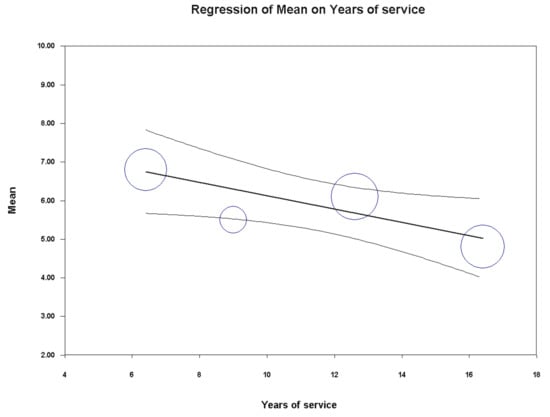 Univariate meta-regression analysis indicated a significant association between the PSQI global score and years of service (coefficient = −0.17, SE = 0.07 [95%CI −0.31 to −0.04], z = −2.54, p = 0.0112) and percentage of policemen on evening/night shifts (coefficient = 0.05, SE = 0.01 [95%CI 0.03 to 0.08], z = 5.75, p = 0.0000) (Figure 9 and Figure 10). On the contrary, year of publication (p = 0.9902), country (p = 0.7936), gender (p = 0.4032), mean age (p = 0.2271), hierarchical role (p = 0.8845), BMI (p = 0.8689) and sample size (p = 0.3752) did not achieve the significance threshold. As for the previous meta-analysis, for the other variables under study, it was not possible to perform any meta-regression analysis due to the insufficient number of studies. Furthermore, for the same reason, it was not possible to run a multivariate meta-regression analysis.