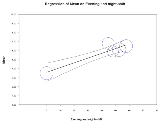 Meta-regression analysis showing a statistically significant association between the pooled PSQI global score in police officers and the percentage of policemen on evening/night shift.