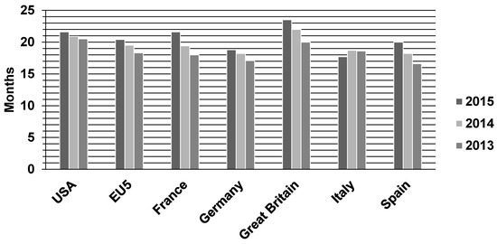 The amount of WEEE has been rising each year due to technological innovations and shortening of lifetimes of electronic equipment. The lifetime of several electronic devices can be estimated as follows: 2–5 years for a computer, 1–2 years for a mobile phone (for smartphones this not more than 18 months to 2 years [12,26,27,28]. The lifecycle of smartphones in selected countries from 2013 to 2015 is shown in Figure 1. Therefore, millions of computers and mobile phones are discarded annually all over the world [29,30].