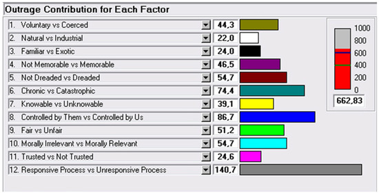 The subsequent outrage management application gave noteworthy results. During the new strategy simulation, the most outrageous factor (“Responsive/Unresponsive process”) disappeared among the critical factors, suggesting that there should be more collaboration between categories of stakeholders. In particular, changing the answers within the two most critical factors (“Controlled by them/by us”; “Responsive/Unresponsive process”), which refer to the relationship between the population and the public administration, the outrage assessment score decreased to 510.02, below the critical threshold of 600 (acceptable outrage level).