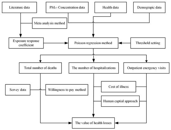 Firstly, this paper determined the exposure–response coefficients between PM2.5 pollution and different health endpoints of residents by means of meta-analysis based on the collected literature data. On this basis, after combining PM2.5 concentration data, population data, and health data, the Poisson regression model was used to calculate the number of deaths, hospitalizations, and outpatient emergency visits induced by PM2.5 pollution in cities of atmospheric pollution transmission channel in the Beijing–Tianjin–Hebei region. Secondly, according to the questionnaire survey data, the willingness-to-pay method was adopted to determine the statistical life value as the unit economic value of death loss. Then, by multiplying by the number of deaths caused by PM2.5 pollution, the economic value of the number of deaths was calculated. Thirdly, the direct and indirect unit economic value of residents’ hospitalization and outpatient emergency visits was determined by using the disease cost method and human capital method combined with residents’ health data. The economic value of hospitalizations and outpatient emergency visits could be obtained by multiplying it by the number of hospitalizations and outpatient emergency visits induced by PM2.5 pollution. Finally, the economic values of the above health losses could be summarized to obtain the total economic value of health losses induced by PM2.5 pollution in the study area. The frame diagram of construction is shown in Figure 2.