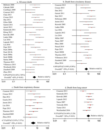 The relationships between PM2.5 and the death risk of all-cause, circulatory disease, respiratory disease, and lung cancer were meta-analyzed using Review Manager 5.3 software (Cochrane Community, Kaifeng City, China), and the forest map was drawn (see Figure 3) based on the selected studies.