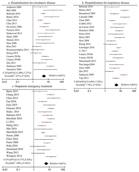 Similarly, the relationships between PM2.5 and the risk of hospitalization for circulatory, hospitalization for respiratory disease, and outpatient emergency treatment were meta-analyzed using Review Manager 5.3 software, and the forest map was shown in Figure 4.