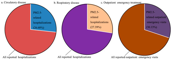 As can be seen from Figure 6, the number of hospitalizations for circulatory disease in the study area in 2016 was 3,625,800, and the number of hospitalizations for circulatory disease caused by PM2.5 pollution reached 967,300, accounting for 26.68% of the total number of hospitalizations for circulatory disease. In the aspect of hospitalization for respiratory disease, 3,285,100 persons were admitted to the hospital, including 899,939 people exposed to PM2.5 pollution, accounting for 27.39% of the total number of hospitalizations for respiratory disease. In terms of outpatient emergency treatment, the statistical visits were approximately 158 million person-times, while the visits induced by PM2.5 pollution reached 47,655,405 person-times, accounting for 30.13%.