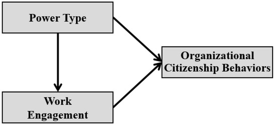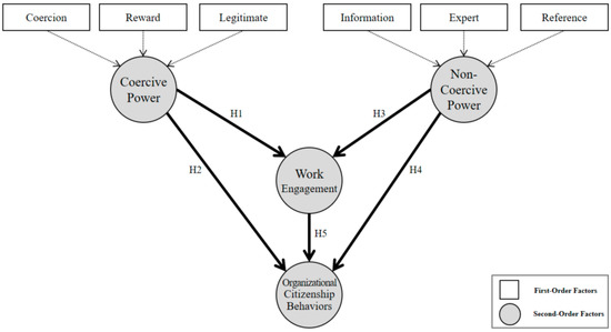 Information, expert, and reference power, which are classified under non-coercive power, occur because of the attractiveness or personal magnetism of the counterparts through their exemplary work performance [17,18,19]. In general, the influence of this type of power is large when there is a belief that the culture or value of a counterpart is amicable and attractive [20,21,22]. As such, non-coercive power is an important factor in decision-making and impacting the behavior of a counterpart [23,24,25]. Furthermore, the expertise and reference of a superior increases the work engagement of organizational members [26,27]. In a meta-analysis of OCB, Ilies et al. [28] revealed that when the organization members have a good relationship with their superiors, there is a higher chance of better performance by the members because of the additional support, information, advice, and opportunities provided by the superiors. Based on the above, hypotheses are established that non-coercive power, such as information, expert, and reference power, will influence work engagement and OCB.