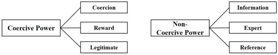 Power is can be classified into coercive power (coercion, reward, legitimate, shown in Figure 3) and non-coercive power (information, expert, reference) [11,12]. Table 1 is an example of a list of the existing research on power.
