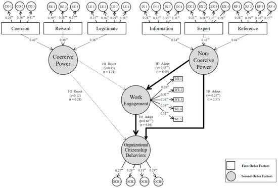The hypothesis that non-coercive power influences work engagement (H3) was statistically significant (γ = 0.53, t = 6.49). This result is the same as the research result of Christian et al. [18], which demonstrated that the expertise and reference of a superior increases the work engagement of the members. Additionally, information (γ = 0.28, t = 2.92), expert (γ = 0.31, t = 3.31), and reference (γ = 0.27, t = 3.16) power were shown to have a significant influence on work engagement in the first-order construct analysis. Consequentially, it is determined that non-coercive power based on building a continuous relationship helps improve work engagement.