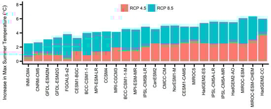 The uncertainty in climate change largely stems from the variations among climate models: the projected average daily maximum summer temperature in the 2090s varies up to 3.7 °C for RCP 4.5 and 4.2 °C for RCP 8.5 across 25 GCMs. Therefore, the choice of climate model is critical in assessing the risk of climate change. Because selecting the most informative climate model is a difficult task, many studies use multiple climate models and use the median value projected using those models. Li et al. (2016) [] used 31 climate models and Petkova et al. (2013, 2017) [,] used 33 climate models. However, the majority of projections relied on a single model, which may under- or over-estimate the median value from a range of climate models.