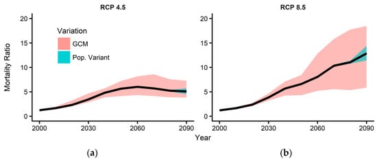 Future temperature-related mortality in summer (from June to August) was projected for every 10-year period up to the 2090s. Future mortality is reported in terms of the mortality ratio (MR) that can be calculated by dividing the estimated future average daily mortality by the baseline average daily mortality over 1991–2015 []. Mortality was projected for 25 GCMs, RCP 4.5 and 8.5, and three population variants (high, medium, and low fertility variants). We chose summer as the target period for the projections because much less is known about adaptation to cold than to hot temperatures [,,,,,,,,].