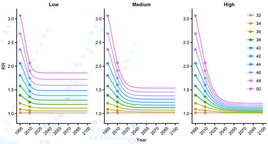 Temperature-specific adaptation curves during 1995–2100. The points in 1995 and 2010 represent the relative risks (RR) for each temperature during the periods 1991–2000 and 2006–2015, respectively.