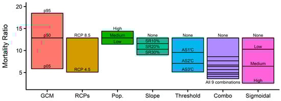 Figure 6 visualizes how climate, population, and adaptation scenarios change the projections of future summer mortality in the 2090s. Adaptation is expected to significantly reduce future temperature-related mortality. Mortality is more sensitive to a shift in the absolute threshold than to the slope reduction; the impact of a 1 °C shift is larger than that of a 20% reduction in the slope. The four adaptation scenarios (slope reduction, the absolute threshold shift, the combination, and sigmoidal function) can reduce the reference MR of 12.9 (median GCM, RCP 8.5, medium population, and no adaptation) by up to 1.4, 2.5, 3.6, and 5.0 times, respectively. As shown in Figure 6, source-specific variations can be compared with each other. In the 2090s, the MR variation associated with climate models is the largest (+44%/−55%), followed by that associated with adaptation (−80%), climate (−60%), and population scenarios (+12%/−11%) compared to the reference MR of 12.9. The MR variation trend in the 2050s is similar to that in the 2090s, as shown in Figure S9.