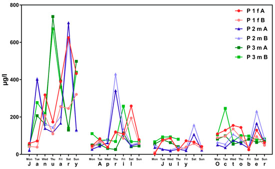 Variability in urinary concentrations of ∑5OH-MEHP + 5oxo-MEHP (A) and 5cx-MEPP (B) in morning urine of one female (f) and two male (m) subjects at the age between 15 and 30 years (general population) over four periods of seven days each (one per season of the year). The number starting with “P” is the subject identifier.