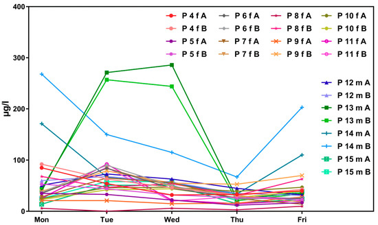 Variability in urinary concentrations of ∑5OH-MEHP + 5oxo-MEHP (A) and 5cx-MEPP (B) in morning urine of eight female (f) and four male (m) subjects at the age between 17 and 20 years (students of a boarding school) over the course of a school week. The number starting with “P” is the subject identifier.