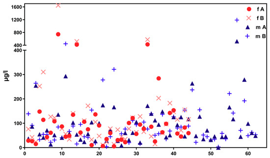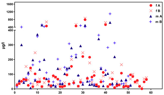 Concentration distribution of ∑5OH-MEHP + 5oxo-MEHP (A) und 5cx-MEPP (B) in morning urine of 44 female (f, red symbols) and 62 male (m, blue symbols). Subjects aged 40 years or older from the general population (“Tübingen Survey”). X-axis: urine samples (from female and male participants) in arbitrary order.