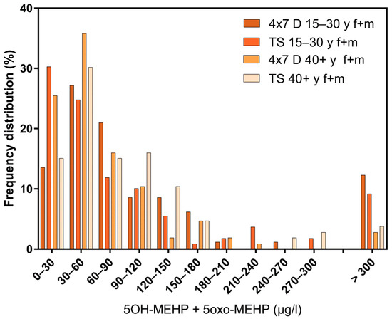 Frequency distribution of the sum of 5OH-MEHP + 5oxo-MEHP in the morning urine of female (f) and male (m) participants. All test subjects age >15 years. Comparison of longitudinal and cross-sectional studies; 4 × 7 d = course of the year study; TS = “Tübingen Survey”; y = age in years. X-axis: categories for ∑5OH-MEHP+5oxo-MEHP in µg/L in morning urine.