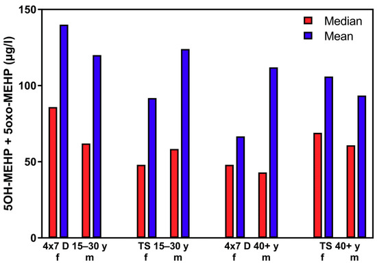 Mean and 50th percentile (median) of the sum of 5OH-MEHP + 5oxo-MEHP for female (f) and male (m) participants aged 15–30 years and ≥40 years for the “course of the years”-longitudinal study (4 × 7 d) and the “Tübingen Survey” cross-sectional study.