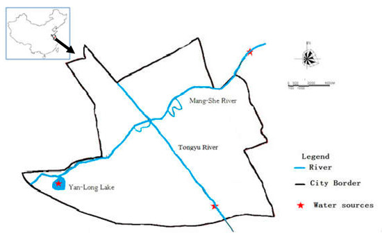 Yancheng (119°34′–120°27′ E, 32°51′–34°12′ N) is an eastern coastal city in the center of the Jiangsu province of China with a population of over 8 million. It faces the Yellow Sea on the east, and is to the west of Yangzhou City and Huai’an City, the north of Lianyungang City, and the south of Nantong and Taizhou cities. The research area is 48.54 km2, shown in Figure 1, with three drinking water sources: the Tongyu River, Mangshe River, and Yanlong Lake. The Tongyu River has a total length of 415 km, originating from the Changjiang River, and ends its course in Lianyungang City. The middle reach of the Tongyu River runs through Yancheng City with a length of 183.6 km, and has an average flow of approximately 100 m3/s. The Mangshe River originates from Dazong Lake and discharges into the East Sea with a total length of nearly 50 km. The Tongyu River and the Mangshe River serve the complex functions of drinking water sources, fairways, irrigation water sources, and flood drainage system. The Yanlong Lake is a man-made ecological lake built in 2012 occupying 2.23 km2 with pretreatment area, ecological wetland purification area, and deep purification area, which also serves as a drinking water source for Yancheng City [17]. Up to now, several water pollution events have occurred in the drinking water sources of Yancheng City. In 2009, sewage from chemical plants with volatile phenolic compounds were illegally drained upstream of water sources, resulting in the cutting off of the water supply for as long as 66 hours, which severely affected the life of nearly 200,000 inhabitants as well as industrial processes. Therefore, the water sources of Yancheng city should be monitored closely and paid more attention to, especially as regards the water quality parameters related to human health.