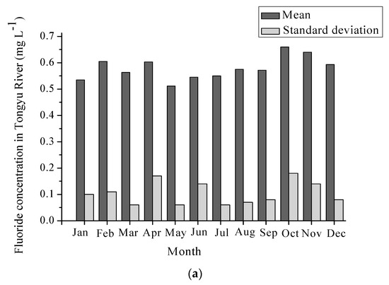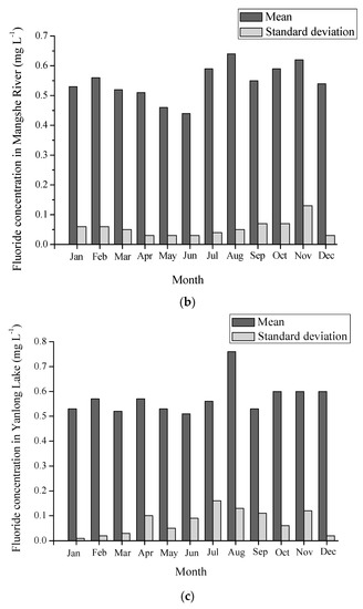 The temporal variations of fluoride concentrations in three drinking water sources are shown in Figure 2. The mean fluoride concentrations were 0.58, 0.55, and 0.57 mg L−1 in the Tongyu River, the Mangshe River, and the Yanlong Lake, respectively. In the Tongyu River, the variation amplitude was slight, with monthly mean fluoride concentrations ranging from 0.51 to 0.66 mg L−1. However, the minimum fluoride concentrations were less than 0.5 mg L−1 in almost all of the months except 0.53 mg L−1 which occurred in October, 2015 and 0.51 mg L−1 which occurred in November, 2013. Furthermore, the fluoride concentration dropped to as low as 0.38 mg L−1 in January, 2010. The low concentration of fluoride may induce dental caries. Similarly, the maximum and mean fluoride concentrations also reached higher values in October and November, 2010, which means that fluoride contents may be associated with groundwater with high fluoride concentration since the river is supplied by groundwater in dry seasons (October and November). The fluoride of shallow groundwater in Yancheng City was reported to exceed the standard level of 1.0 mg L−1, which led to dental and bone fluorosis [22]. Additionally, a rising number of fluorine-related chemical plants were constructed in the Yancheng districts, which may increase the fluoride content and corresponding health risks through irregular discharge of wastewater into surrounding drinking water sources. As for the Mangshe River, the variety range of maximal, minimal, and mean fluoride content remained almost invariable, which suggests that fluoride in the Mangshe River may come from steady groundwater. However, it is worth noting that the maximal fluorides were lowest (<0.5 mg L−1) in May, 2012 and June, 2015, and minimal fluorides were also lowest (<0.5 mg L−1) in May, 2015 and June, 2013. The mean fluoride content reached its maximum value of 0.64 mg L−1 in August. This supported the claim that large quantities of upstream agricultural nonpoint sources and domestic pollution sources were drained into the Mangshe River, especially in flood seasons. The differences between the Tongyu River and the Mangshe River could be due to the fluoride in the Mangshe River being affected by anthropogenic activity more seriously than the Tongyu River. As for the Yanlong Lake, the maximum fluoride content in July, 2012 and August, 2014 reached 0.80 and 0.95 mg L−1, respectively. Since July and August are in flood seasons, large quantities of wastewater probably gave rise to fluoride in the Yanlong Lake.