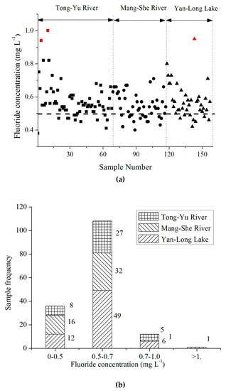 The distributions of fluoride concentration in drinking water sources are presented in Figure 3. In 157 representative water samples, including 68 samples in the Tongyu River, 49 samples in the Mangshe River, and 40 samples in the Yanlong Lake (Figure 3a), the fluoride contents were less than the Chinese sanitary standard for drinking water (1.0 mg L−1), the WHO drinking water quality guideline (1.50 mg L−1) and U.S. standard (2.0 mg L−1). However, in moderate samples (22.9%, n = 157) including 12 samples in the Tongyu River, 16 in the Mangshe River, and 8 in the Yanlong Lake, the fluoride concentrations were less than 0.5 mg L−1 recommended by the WHO to prevent tooth cavity (seen in Figure 3b). This may pose an elevated risk of dental decay, especially for children. Moreover, the data for fluoride concentration refer to drinking water sources, not treated finished water from drinking water treatment plants, where fluoride may be removed by coagulation–sedimentation in the traditional purification process. The removal efficiency depends on the type of coagulants, dosage, and sedimentation time. The removal of fluoride increased the risk of dental decay for children. For preventing dental decay, adding fluoride to drinking water is an effective measure. In the U.S., the prevalence rate of dental caries has dropped by 50%–60% in the last 30 years as a result of fluoridation in drinking water. Similar operations could be found in other countries such as England, Russia, Brazil, and Cuba. Therefore, local governments should take measures to prevent dental decay, such as promoting the use of toothpaste with fluoride.