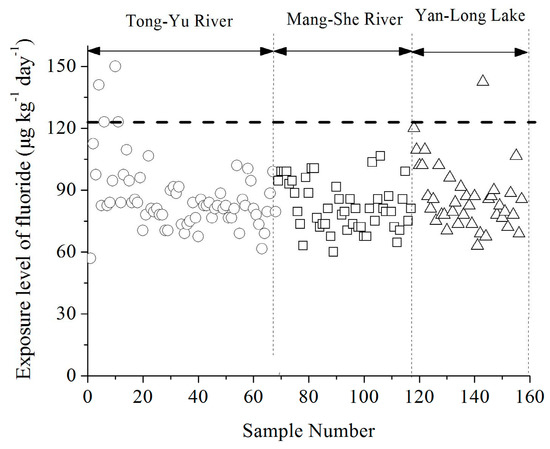 Exposure of fluoride for infants in the three drinking water sources of Yancheng City. Note: Dashed line in Figure 4 refers to the toxicity reference value of 122 μg kg−1 d−1, which is recommended by Health Canada.