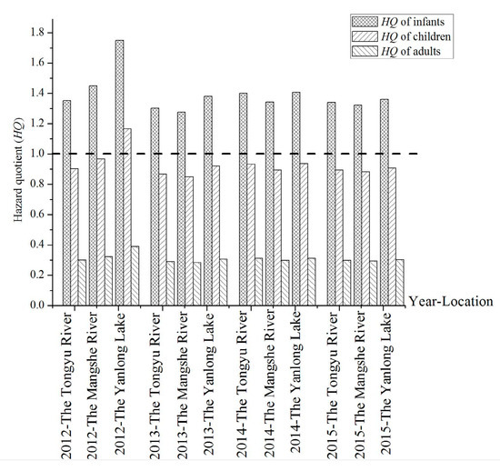 The hazard quotients were calculated using Equation (2) and shown in Figure 5. All the hazard quotients of infants were higher than the recommended value of 1.0 by United States Environmental Protection Agency (USEPA). The results suggested that the infants in Yancheng City suffer from the health risks associated with fluoride. Compared with the Tongyu River and Mangshe River, the hazard quotients were the biggest in Yanlong Lake in 2012 and 2013. In 2012, the hazard quotients showed a significant difference among the three drinking water sources. However, in 2015, the hazard quotients of the three drinking water sources were similar. In addition, the hazard quotients of children and adults were almost always lower than 1.0 except in Yanlong Lake in 2012, which means that the children and adults would not suffer from the harmful effects associated with daily fluoride intake.