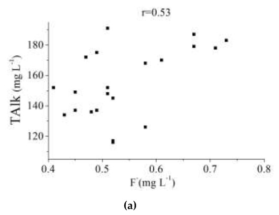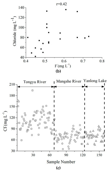 Pearson correlation coefficients for the possible relationships between fluoride and the other monitored physicochemical parameters are summarized in Table 3. There is a positive relationship between fluoride and total alkalinity (TAlk) (r = 0.53), suggesting that fluoride content is associated with the increase of alkalinity in surface water, which is similar to results from other literature [24]. The concentrations of TAlk in the Tongyu River are higher than the Mangshe River and Yanlong Lake, where the concentration of fluoride is also the highest. The correlation between fluoride and TAlk is shown in Figure 6a. Besides TAlk, the statistical relationship between fluoride concentration and Cl− is shown in Figure 6b with positive correlation coefficients of 0.42. The chlorine contents in three drinking water sources are shown in Figure 6c. Similar to fluoride, the chlorine contents in the Tongyu River are obviously higher than those in the Mangshe River and Yanlong Lake. As for the other parameters, the relationship between fluoride and pH, SO42−, and TDS are positive with correlation coefficients of 0.39, 0.22, and 0.11, respectively. Moreover, the relationship between fluoride and Na+ and K+ are negative with correlation coefficients of −0.15 and −0.47, respectively.