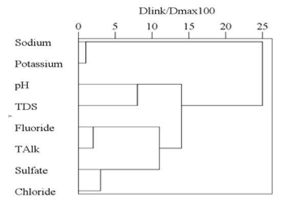 The R-mode cluster analysis was carried out for different physicochemical characters, and the results are shown in a Figure 7. All the variables are grouped into four clusters in a convincing way of Dlink/Dmax × 100 < 10. Fluoride (F−) and total alkalinity (TAlk) were grouped into a cluster. The correlation between F− and TAlk is also shown in Table 3 and Figure 6a with a correlation coefficient of 0.53. In addition, the correlation between sodium (Na+) and potassium (K+) is shown in Table 3 and Figure 8a with a correlation coefficient of 0.68. Similarly, the correlation between sulfate (SO42−) and chloride (Cl−) is shown in Table 3 and Figure 8b with a correlation coefficient of 0.52.